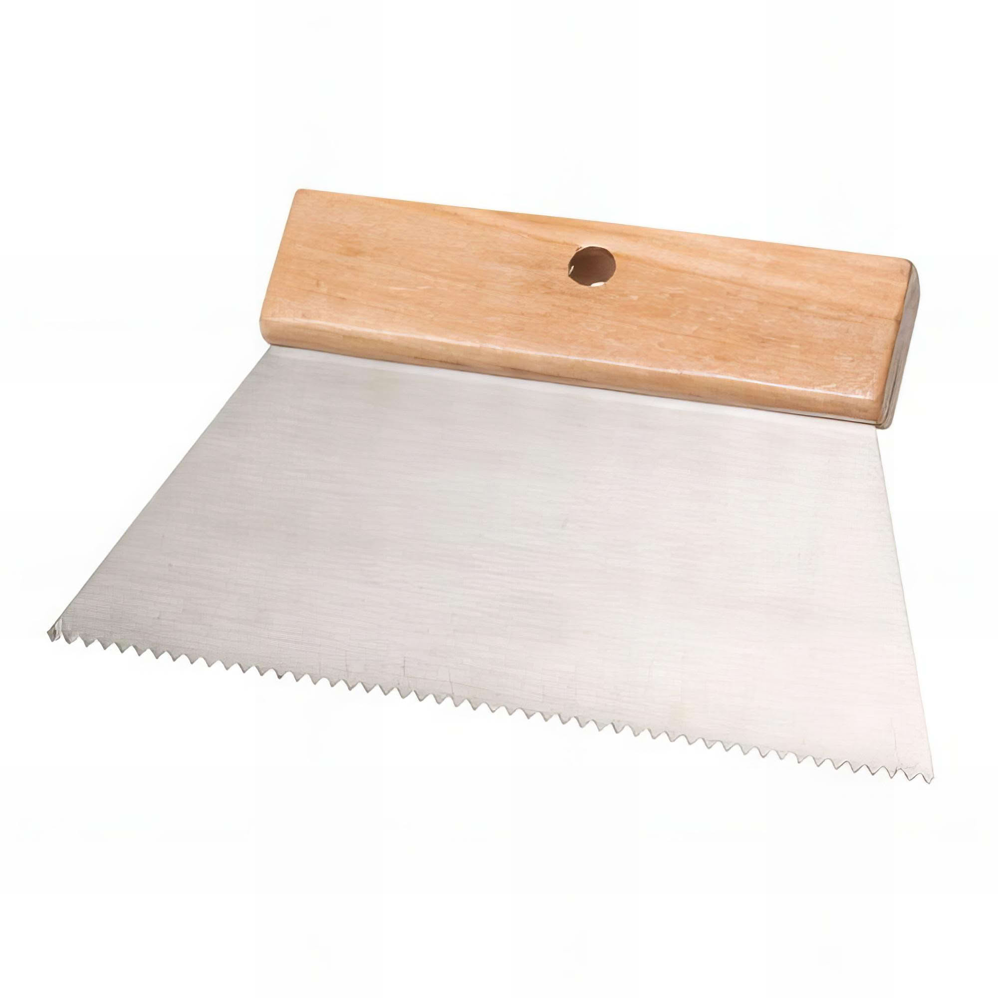 Pour étaler la colle de façon uniforme. Denture en «V». Manche en bois, lame acier. Longueur 200 mm. Denture L x h (mm): 4 x 2.5. Dimensions (mm): 200.